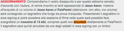Si scatena il web: fan che si incazzano, e di brutto, perché secondo loro l'editore è scorretto e punta solo a far soldi, non rispettando chi ha già preso i libri. E non mi sento di dar loro torto: passino i disegni, per i quali chiunque ospita un autore può chiedere, secondo me, l'acquisto minimo che vuole, ma per le firme ognuno dovrebbe lasciare - ragionevolmente - una certa libertà.
